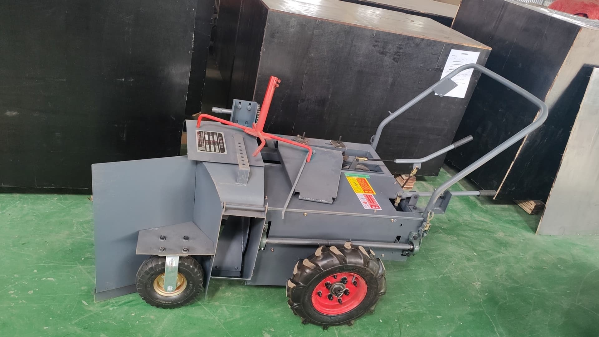 整机采用电动(柴油)动力结构,将散状颗粒性原料就地翻拌,省力省时,翻拌均匀,工效高。机器通过料耙将原料送入喂料轮再通过离心风轮加速抛出出料口,随机带有驱动机械,省力省时。该机采用铝壳变速箱结构,简单直接,设有前进、空档、后退三个档位。